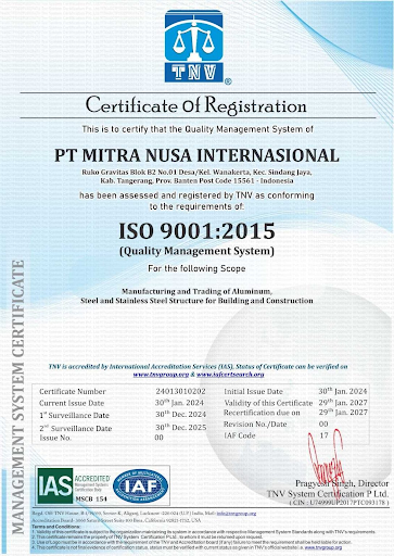 Sebagai perusahaan manufaktur resmi, PT Mitra Nusa Internasional telah memenuhi berbagai persyaratan legalitas dan standar industri untuk mendukung kebutuhan proyek nasional maupun swasta.